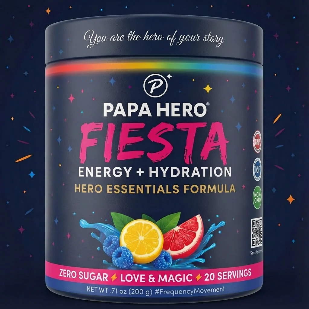 PAPA HERO® is the world's first 528Hz Love Frequency-infused energy drink. Our HERO ESSENTIALS™ FORMULA contains 100mg natural caffeine from plant-based tea, 1,000mg organic nootropics, 350mg electrolytes, 700mg Vitamin C, and 11 essential vitamins & minerals. Zero sugar, vegan, gluten-free. Love & Magic, Everyday.